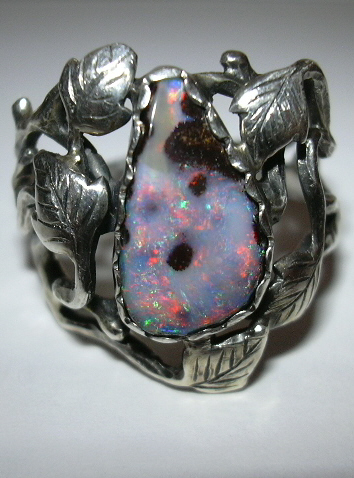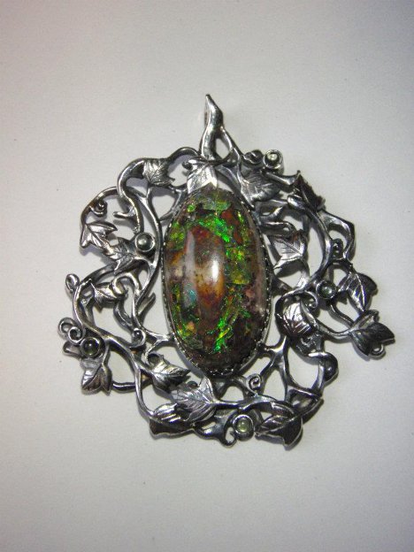 Dieser große Boulderopal wurde für eine Stammkundin in eine Blätterranken-Fassung aus Silber mit Zitrin- und Peridotcabochons eingearbeitet. Durchmesser 4cm.