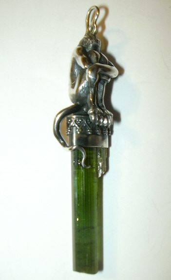 Dieser Kettenanhänger mit einem aus Sterling-Silber gefertigten, kleinen „Dämon“ wurde als besondere Fassung für einen Turmalin gefertigt. Die Länge beträgt ca. 7cm.