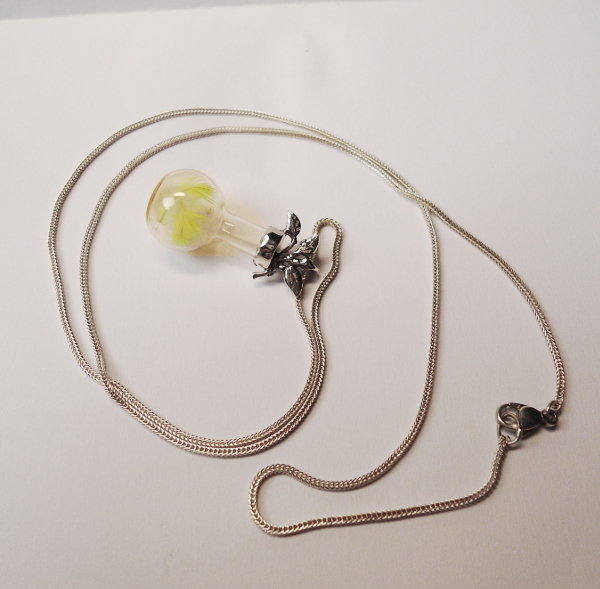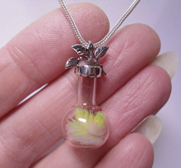 Collier aus 925er Silber mit kleinen Federn im Glasfläschchen.