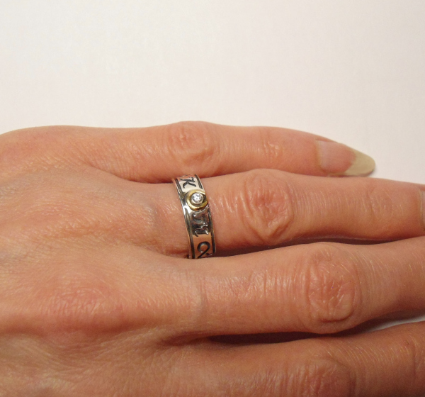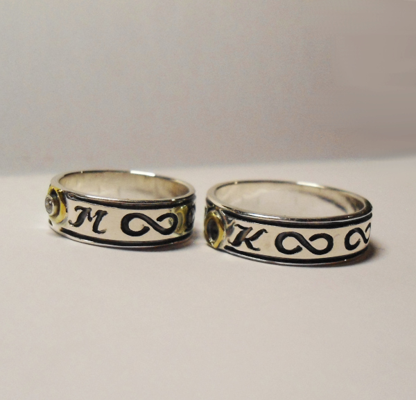 Handgearbeitete Eheringe aus 925er Silber und 585er Gelbgold mit Ihren Initialen und einem Brillant im Damenring. Die Initialen können auf Anfrage auch in Druckschrift oder anderen Schriftzeichen (z.B. Runen) eingearbeitet werden.