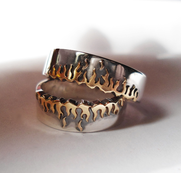 Eheringe aus 925er Sterling-Silber und filigran gearbeiteten Flammen aus 585er Gelbgold.