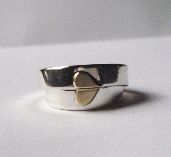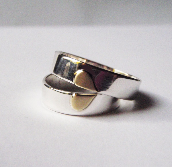 Handgearbeitete Eheringe aus 925er Silber mit geteiltem Herz aus 585er Gelbgold. Auf Wunsch auch in Gelbgold mit Herz aus Weißgold oder aus Weißgold mit Herz aus Gelbgold (Preise hierfür auf Anfrage).