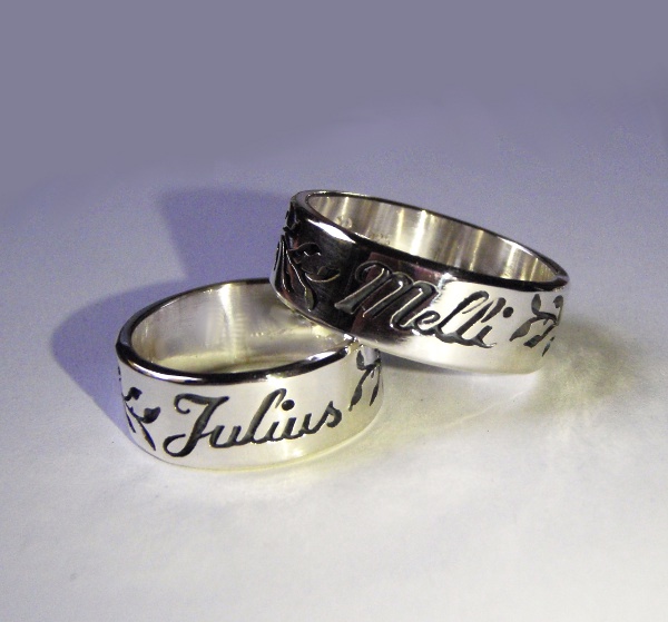 Der jeweilige Name ist vertieft in den Ring eingearbeitet, links und rechts dezente Blätterranken.