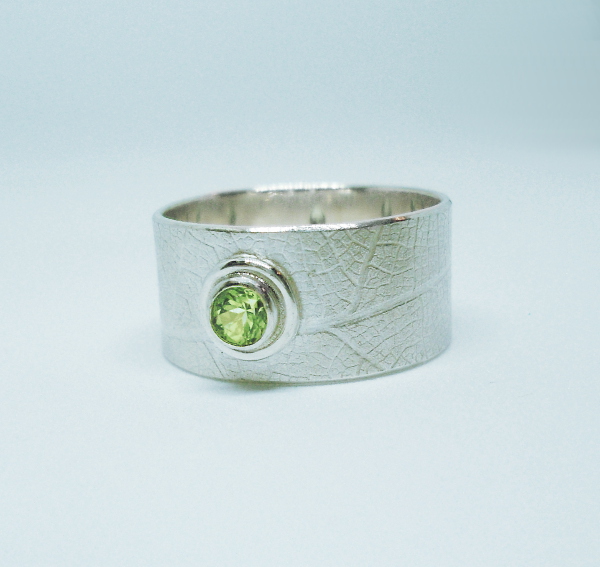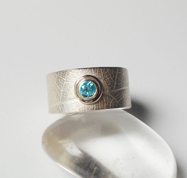 Ring aus 925er Silber mit einem Muster aus feinen Blattadern und Edelstein.