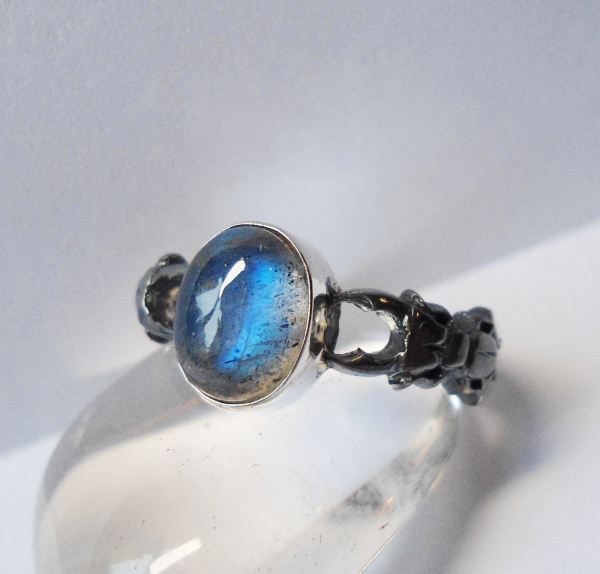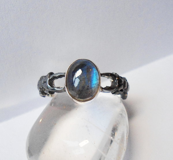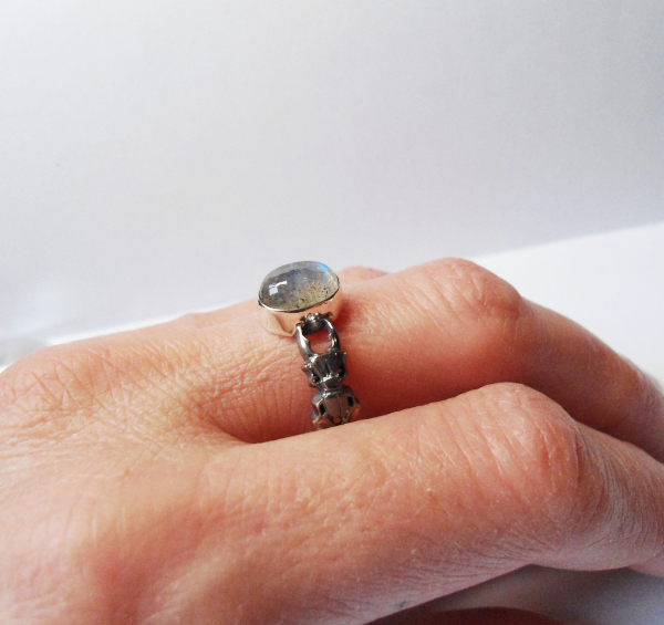 Aufwendig gearbeiteter Ring aus 925er Silber mit Labradorit und kleinen Hirschkäfern.