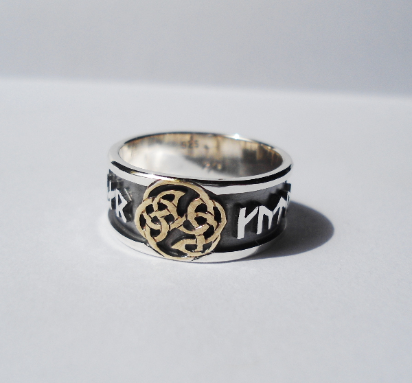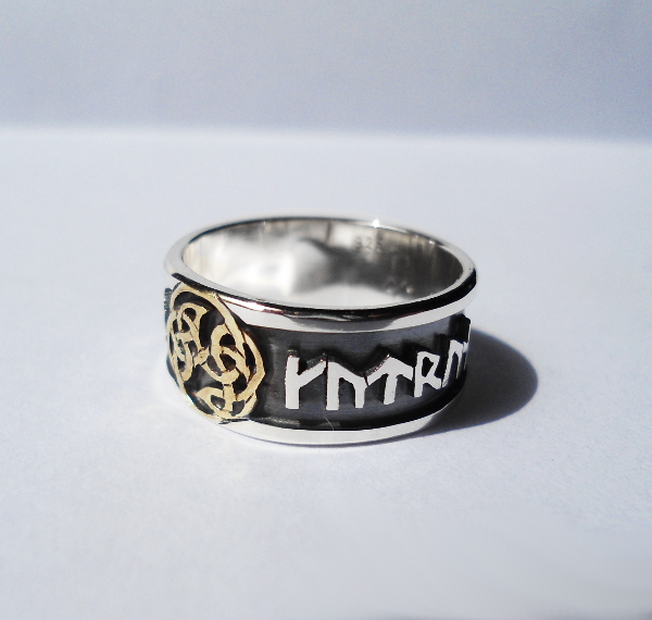 Ring aus 925er Silber mit keltischem Knoten aus 585er Gelbgold und Ihren Namen in Runen. Anstelle von Namen können Sie auch Runen auswählen, die eine besondere Bedeutung für Sie haben.